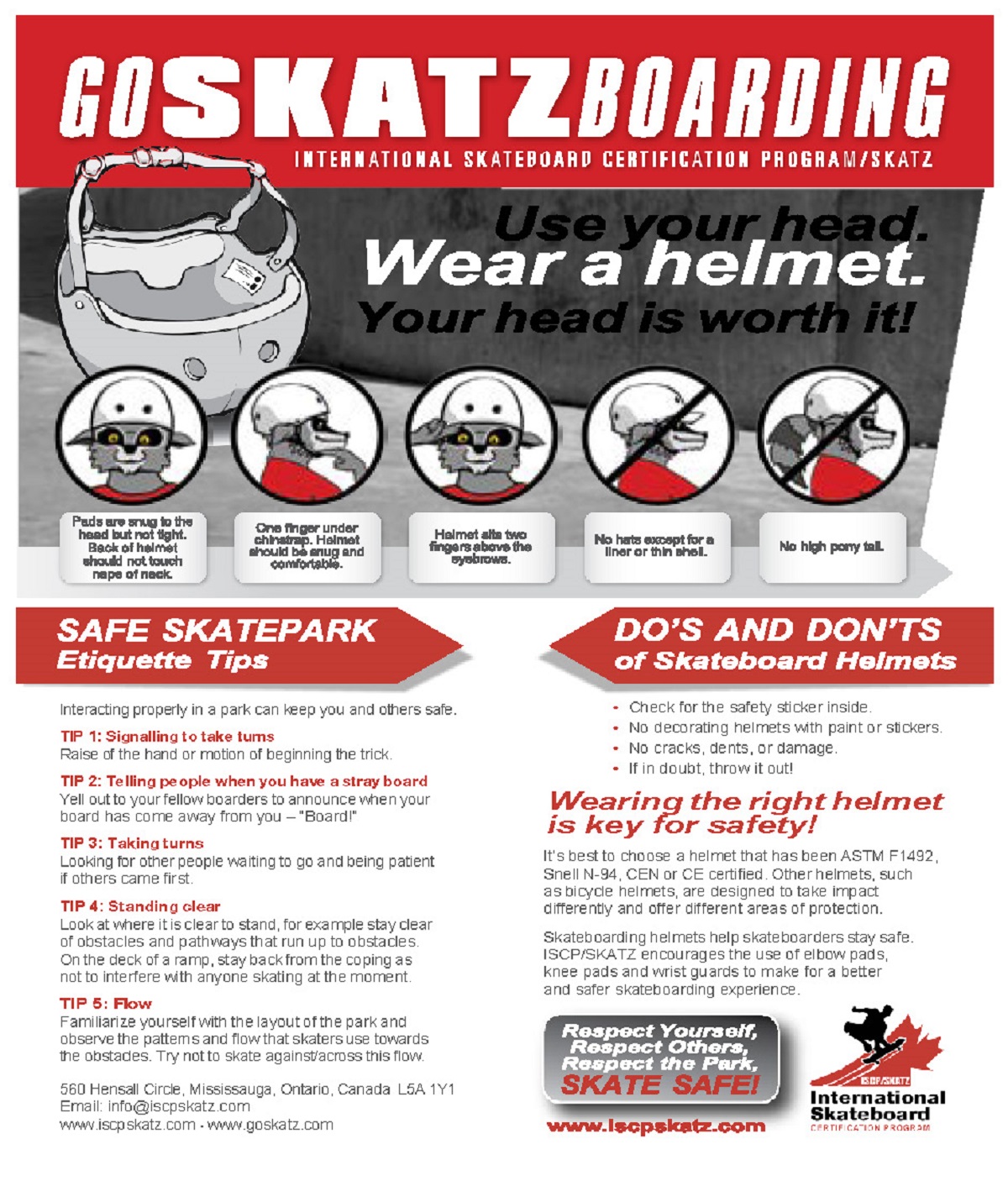 Wearing the right helmet is key for safety. Use only approved skateboard helmets. Other helmets, such as bicycle helmets, are designed to take impact differently and offer other areas of protection.